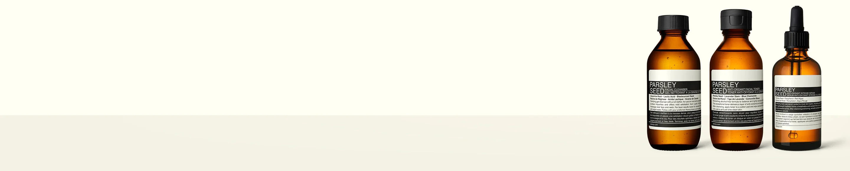 Many Aesop formulations employ skin-fortifying anti-oxidants, with each ingredient carefully selected for the benefits it offers to the skin. Vitamin C, for example, is a potent anti-oxidant known for its brightening properties and role in supporting skin suppleness and resilience; while Vitamin E—also a superb anti-oxidant—is renowned for the nourishing and skin-softening benefits it confers. Many essential oils and botanical extracts are also renowned for their anti-oxidant properties, including Parsley Seed, Blue Chamomile and Green Tea, ingredients frequently used in Parsley Seed Skin Care formulations.